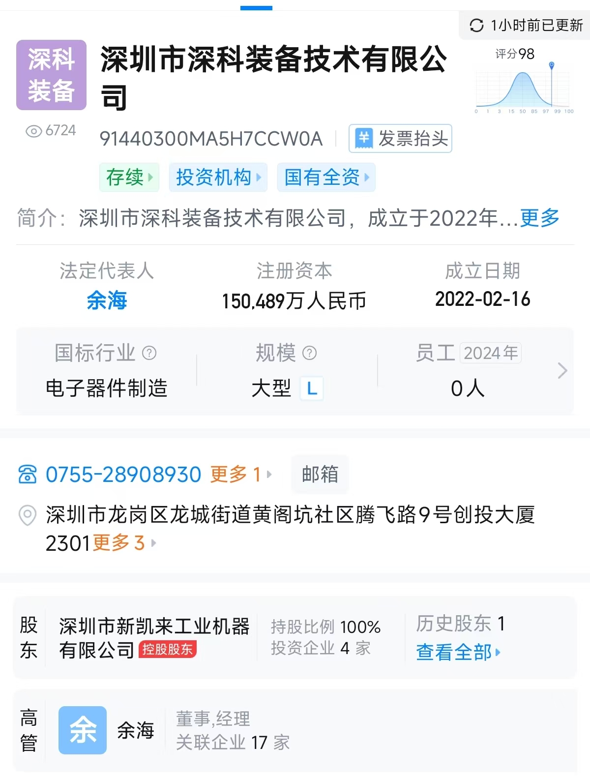 股权全景穿透图显示,该公司由新凯来旗下深圳市新凯来工业机器有限公司全资持股。